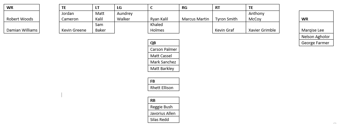 It’s interesting that if you took all of these players and added one more, it would be a complete NFL roster (in terms of numbers). The depth would be absolutely horrid and badly distributed, but you could definitely scrape a team together. It actually works out to 26 on defense and 26 on offense. With zero injuries, this mock team could possibly be competitive: